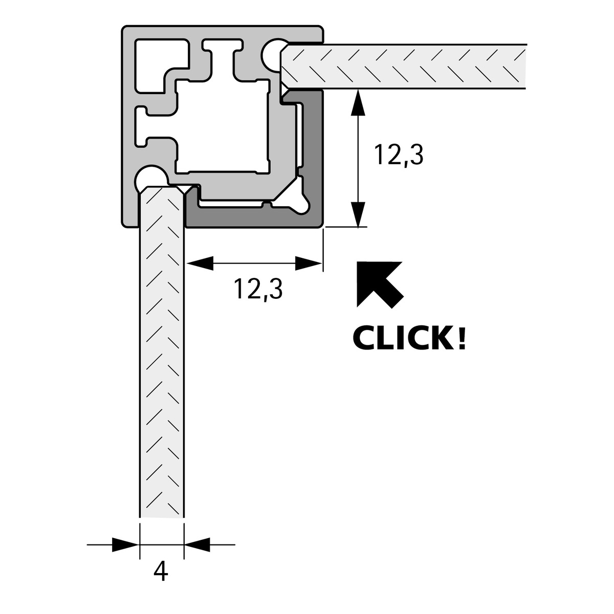 Пластиковий елемент для кріплення двох скляних елементів товщиною 4 мм та завершення зовнішнього вигляду кутового профілю для скла.
