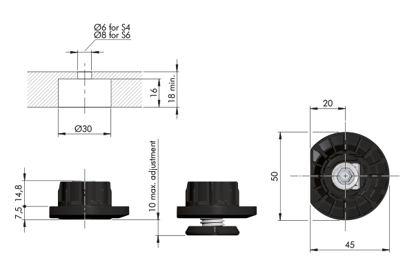 Ніжка Integrato TECH Z врізна Ø30, з регулюванням h=10мм, 175кг, Italiana ferramenta