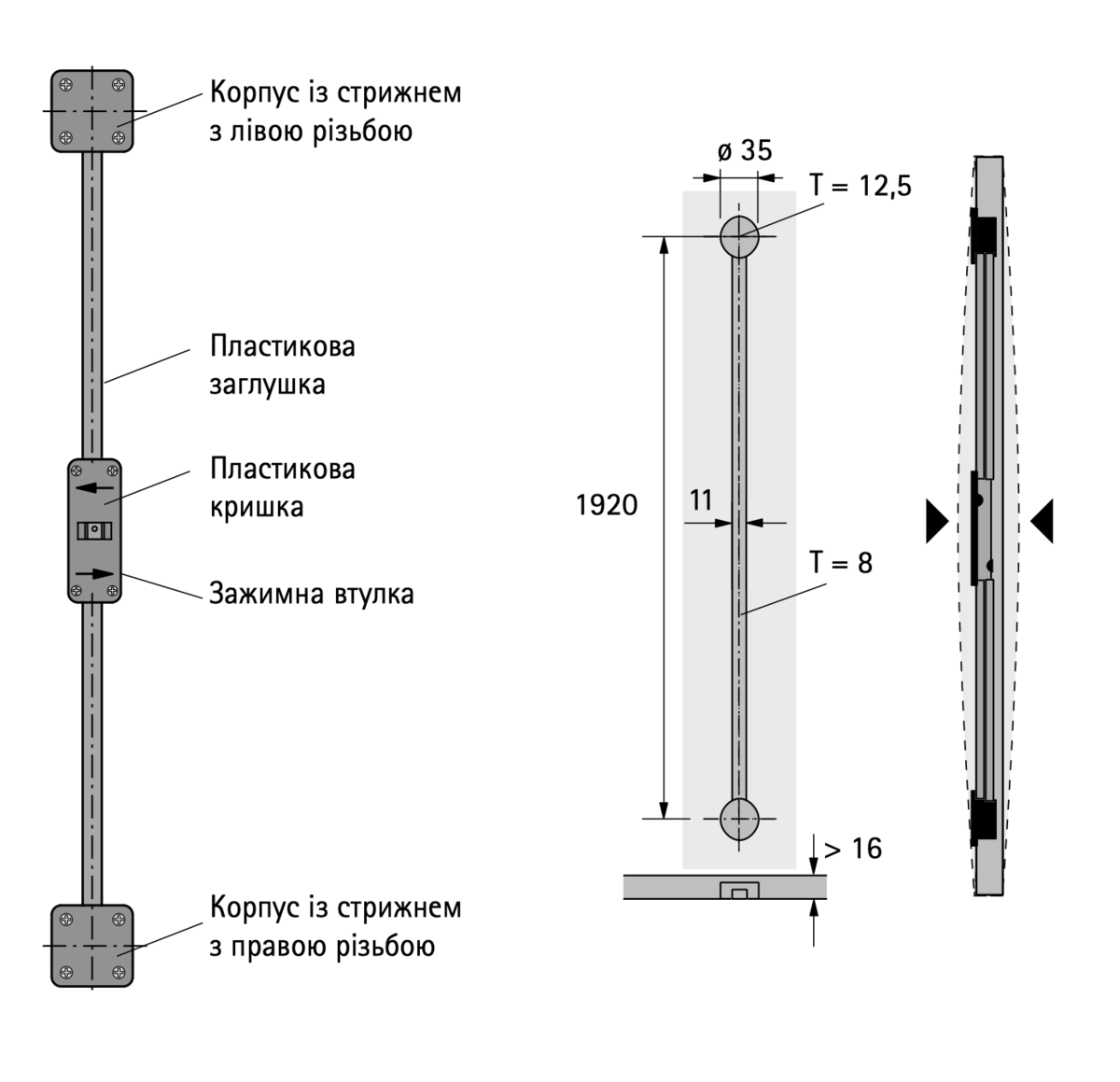 - Проста установка: дві штанги, з правим і лівим різьбленням, вкручуються в гільзу з внутрішнім різьбленням.
