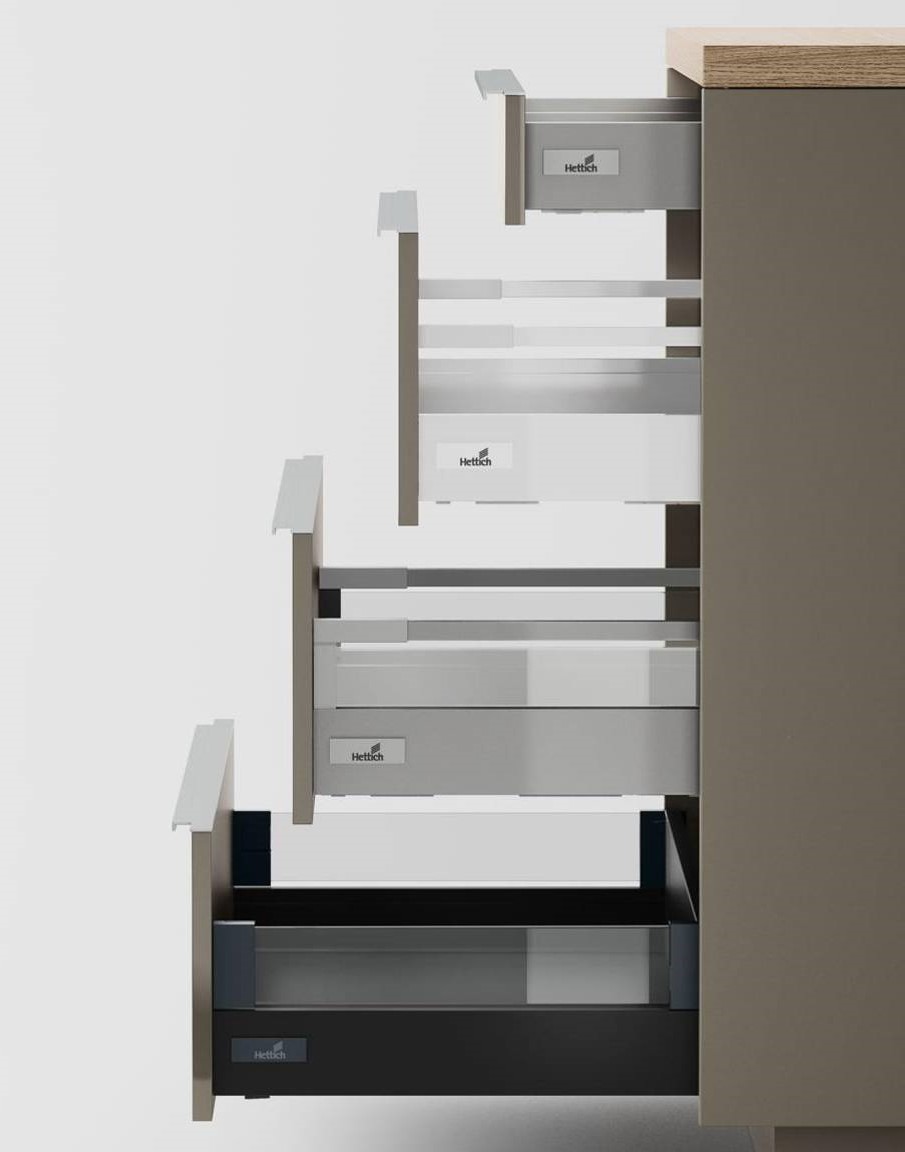 Поєднуйте бездоганну якість та вигоду: надійні шухляди повного висування у трьох сучасних кольорах – білий, антрацит, срібло. Глибина: 470 мм та 520 мм.