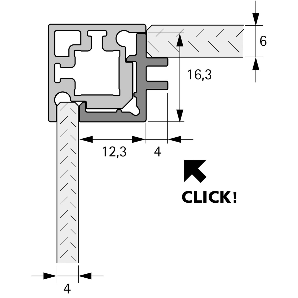 Пластиковий елемент для встановлення панелі зі скла товщиною 4 мм (загартоване скло) з одного боку профілю та панелі зі скла або оргскла товщиною 6 мм з іншого боку профілю.