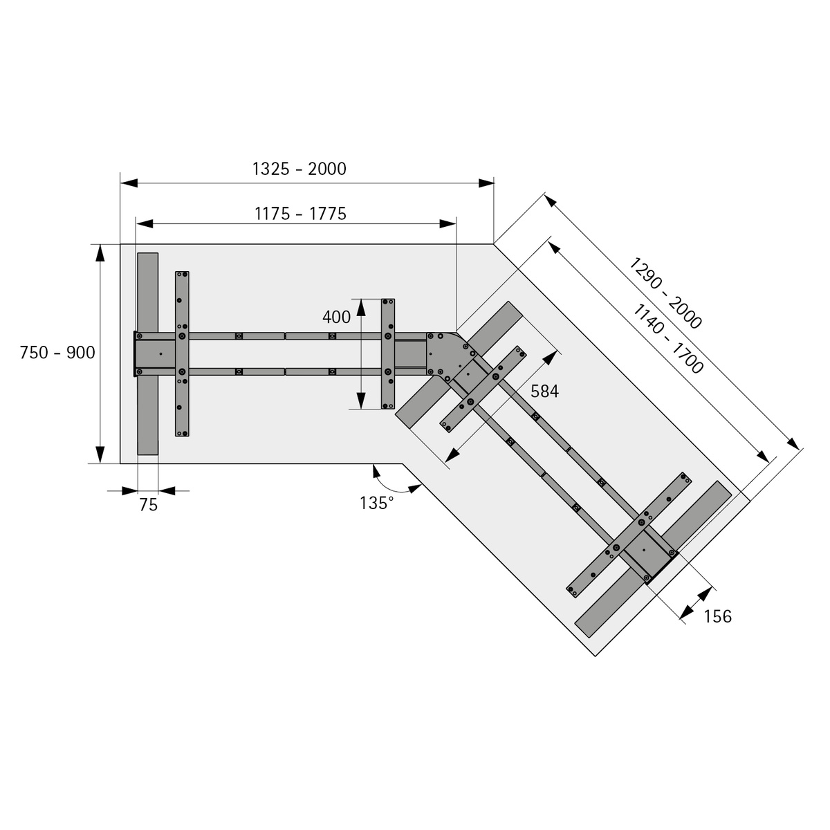 - Ширина 1325 - 2000 мм / 1290 - 2000 мм - Регулювання по висоті від 625 - 1285 мм