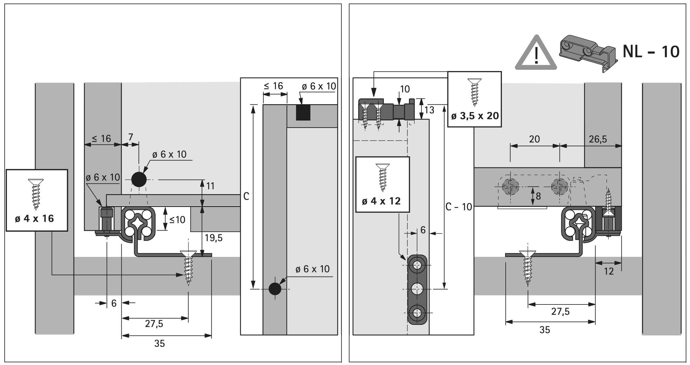 - Використання заднього кріплення зменшує довжину шухляди (NL) на 10 мм