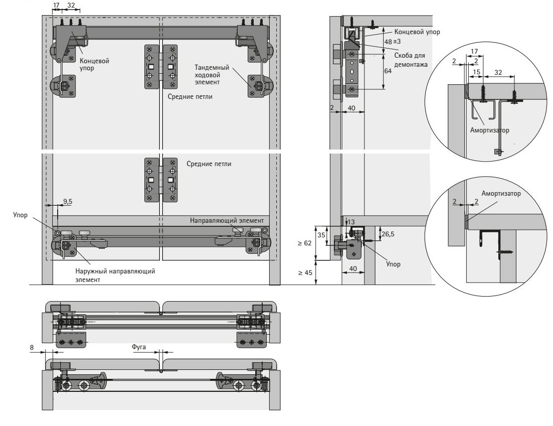 - 2 кронштейни для кріплення дверей до ходового елемента з регулюванням по висоті +/–5 мм