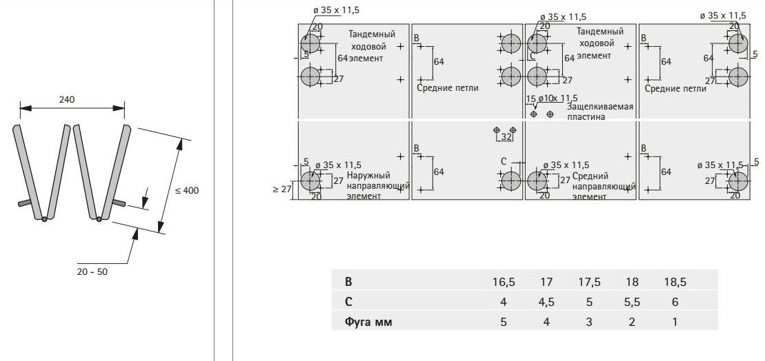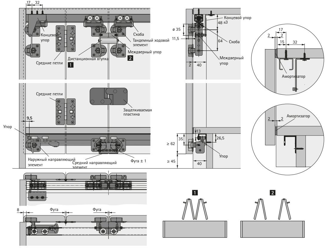 - 4 підтримуючі кронштейни для кріплення дверей до ходового елемента з регулюванням по висоті +/–5 мм