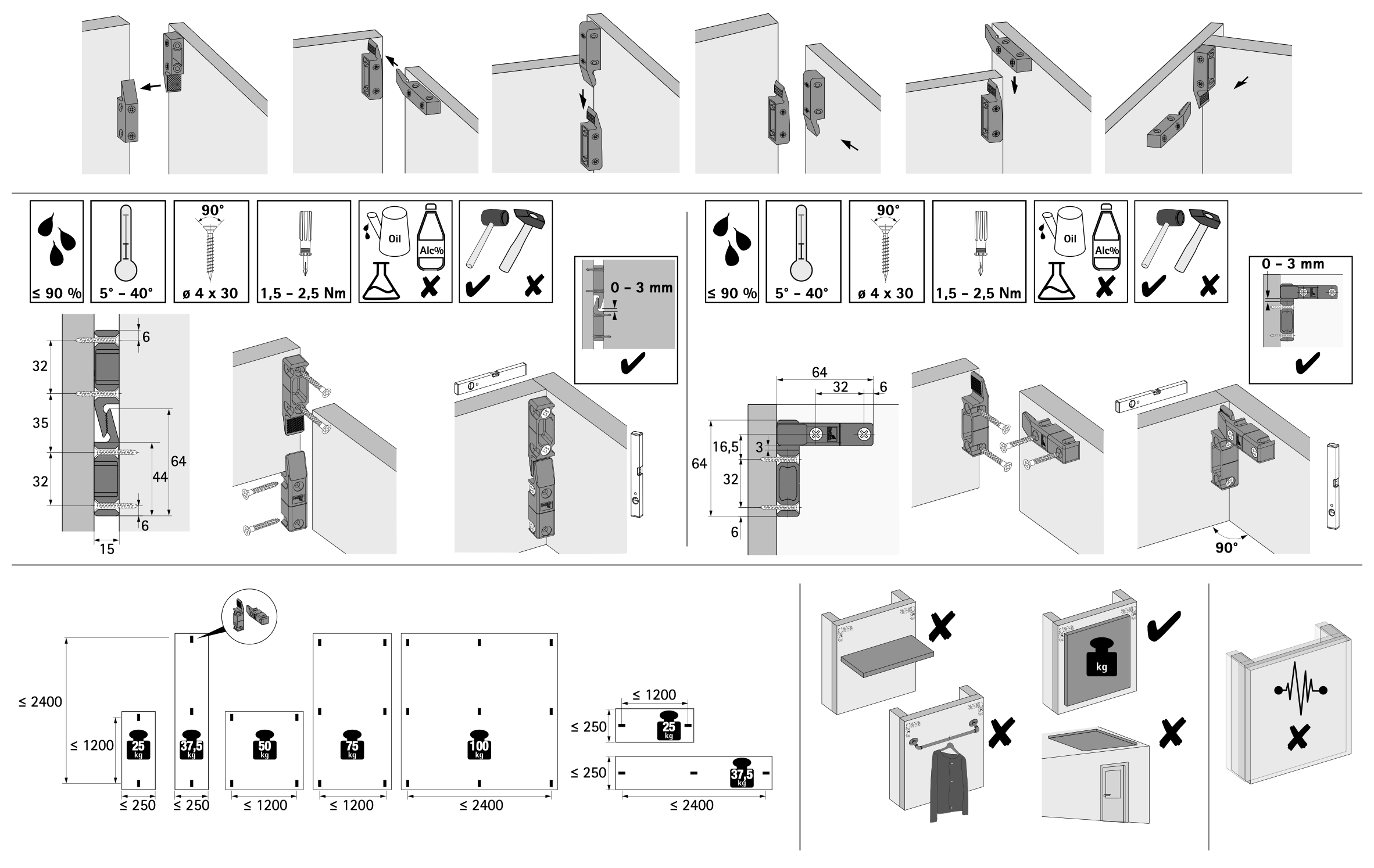 та зубчастим поверхням.Навантажувальна здатність вказана в інструкції з монтажу - Різні позиції для прикручування забезпечують навішування зверху, спереду, збоку і т.д. а також урівень